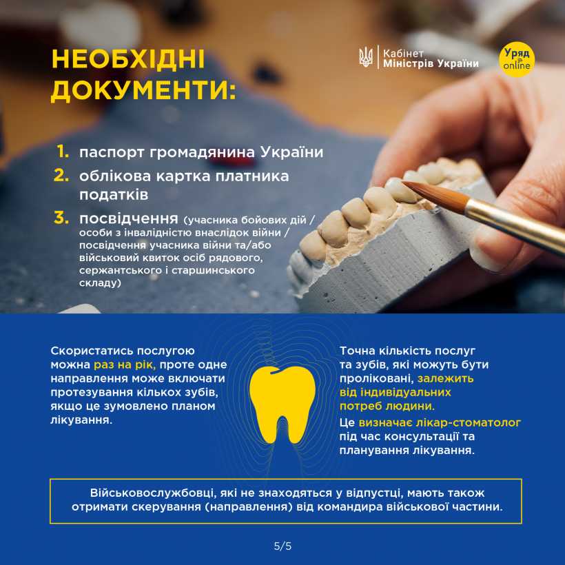 Держава запустила пілотний проєкт з безоплатного зубопротезування та лікування для учасників бойових дій, осіб з інвалідністю внаслідок війни та військовослужбовців.